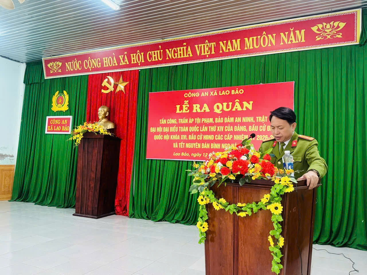 Sáng ngày 12/12/2025, Công an xã Lao Bảo tổ chức Lễ ra quân mở đợt cao điểm tấn công, trấn áp tội phạm, bảo đảm an ninh, trật tự Đại hội đại biểu toàn quốc lần thứ XIV của Đảng, bầu cử đại biểu Quốc hội khoá XVI, Hội đồng nhân dân các cấp nhiệm kỳ 2026-2031 và Tết Nguyên đán Bính Ngọ năm 2026. Tham dự Lễ ra quân có đồng chí Trần Anh Vũ, Phó Bí thư Đảng ủy, Chủ tịch UBND xã; các đồng chí lãnh đạo Đảng uỷ, HĐND, UBND, UBMTTQ Việt Nam xã, các cơ quan, ban, ngành, lực lượng vũ trang nhân dân đóng quân trên địa bàn cùng toàn thể cán bộ, chiến sĩ Công an xã Lao Bảo và đại diện lực lượng ANTT cơ sở trên địa bàn xã.